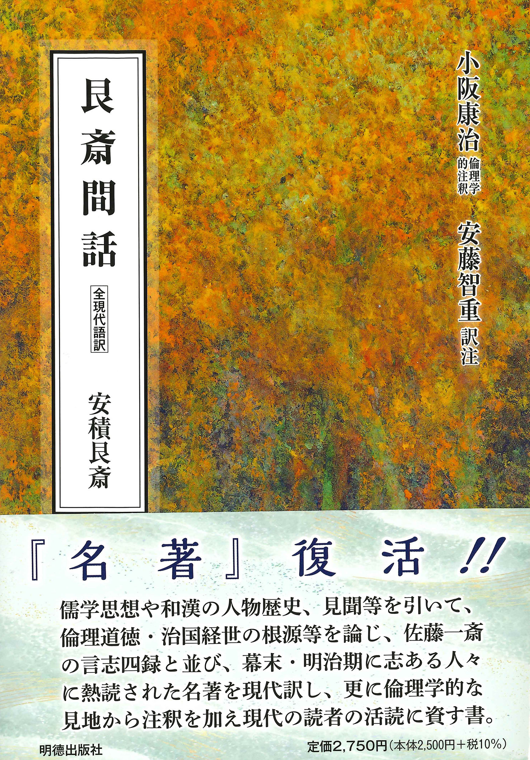 定価 2,750 円(税込) 著者 小坂 康治(コサカ ヤスハル)・安藤 智重(アンドウ トモシゲ) B6判並製302頁 ISBN978-4-89619-319-0 アマゾン 楽天 版元ドットコム ・内容紹介 儒学思想や和漢の人物歴史、見聞等を引いて、倫理道徳・治国経世の根源等を論じ、佐藤一斎の言志四録と並び、幕末・明治期に志しある人々に熱読された名著を現代訳し、更に倫理学的な見地から注釈を加え現代の読者の活読に資す書。