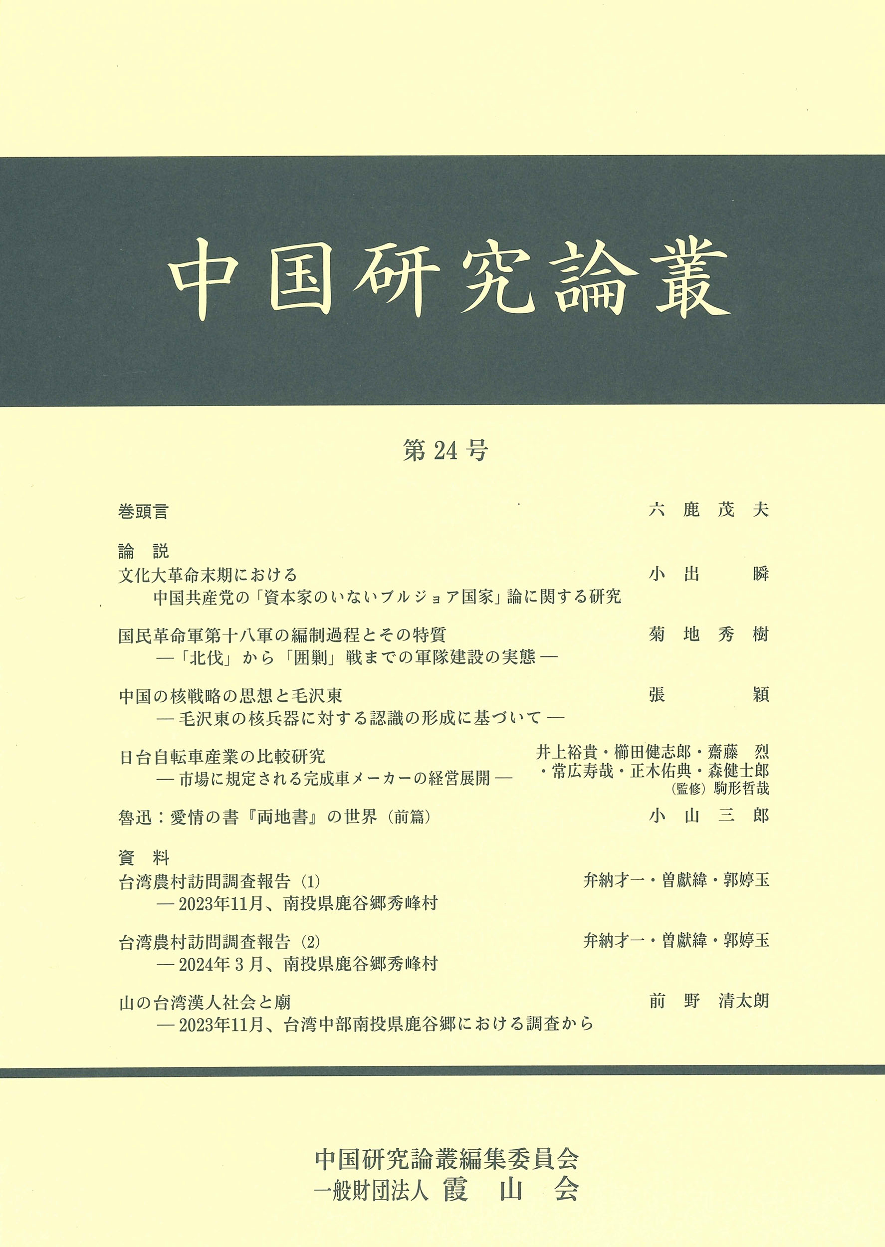定価1,320 円(税込) 著者 中国研究論叢編集委員会(チュウゴクケンキュウロンソウヘンシュウイインカイ) B5判並製162頁 ISBN978-4-89619-660-3 アマゾン 楽天 版元ドットコム ・目次 文化大革命末期における中国共産党の「資本家のいないブルジョア国家」論に関する研究/国民革命軍第十八軍の編成過程とその特質/中国の核戦略の思想と毛沢東/日台自転車産業の比較研究/魯迅:愛情の書『両地書』の世界(前篇)