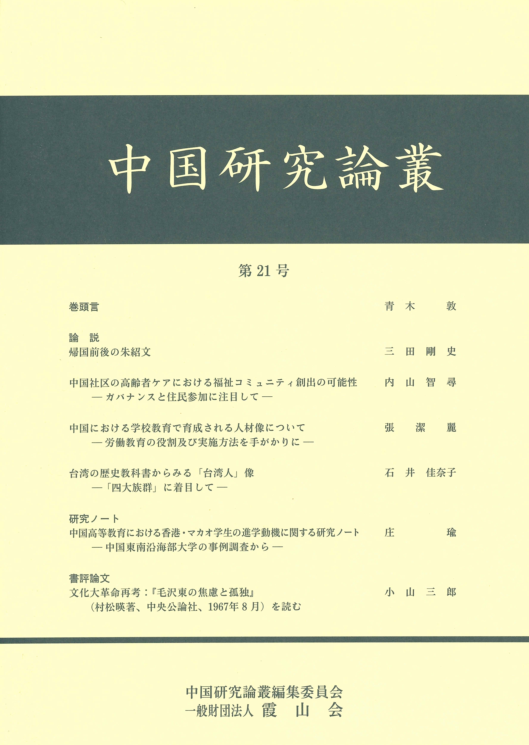 定価 1,320 円(税込) 著者 中国研究論叢編集委員会(チュウゴクケンキュウロンソウヘンシュウイインカイ) B5判並製110頁 ISBN978-4-89619-657-3 アマゾン 楽天 版元ドットコム ・目次 帰国前後の朱紹文/中国社区の高齢者ケアにおける福祉コミュニティ創出の可能性/中国における学校教育で育成される人材像について/台湾の歴史教科書からみる「台湾人」像/中国高等教育における香港・マカオ学生の進学動機に関する研究ノート/文化大革命再考:『毛沢東の焦慮と孤独』