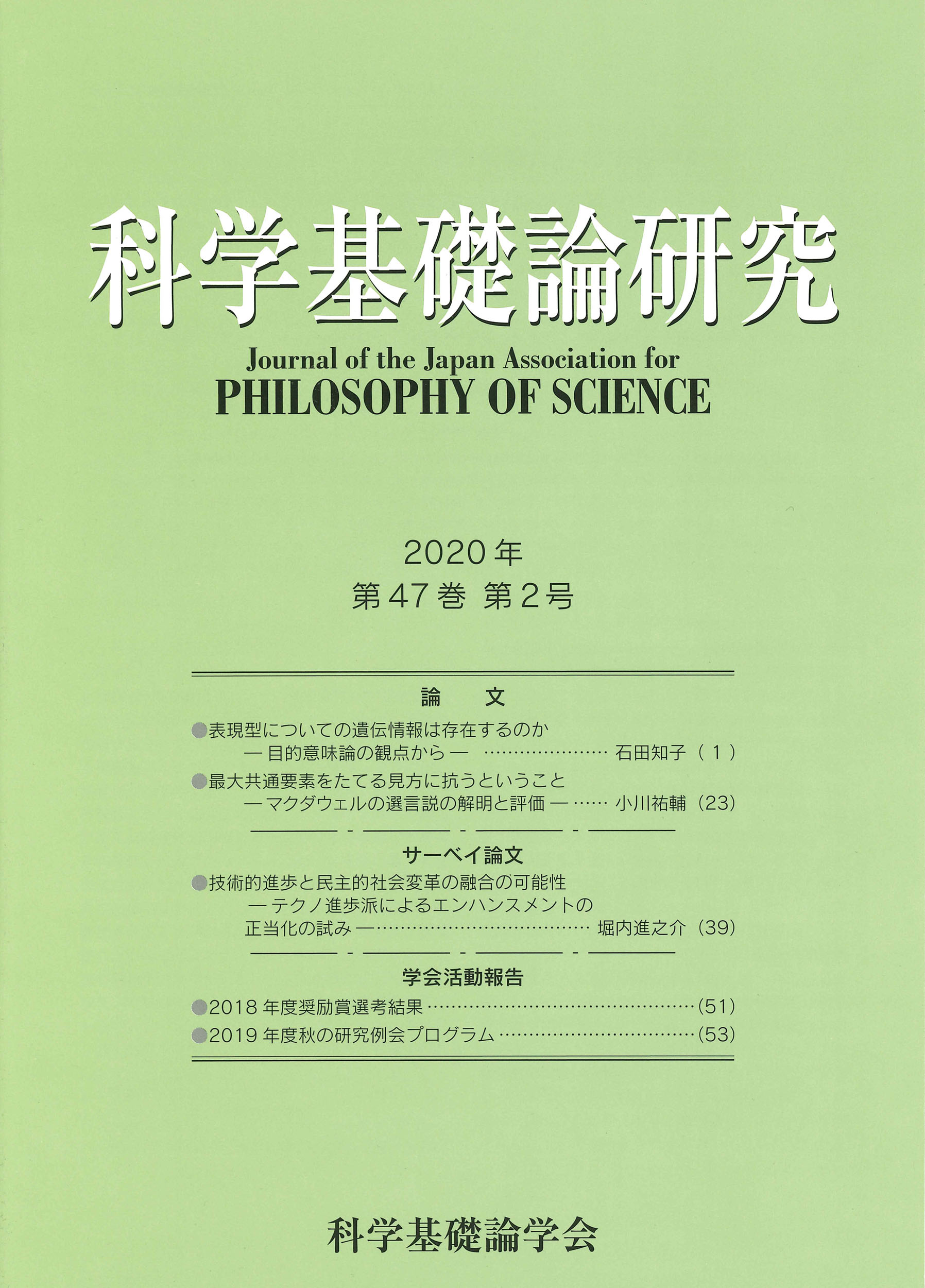 定価 1,650 円(税込) 著者 科学基礎論学会(カガクキソロンガッカイ) B5判並製111頁 ISBN978-4-89619-841-6 アマゾン 楽天 版元ドットコム ・目次 表現型についての遺伝情報は存在するのか 最大共通要素をたてる見方に抗うということ 技術進歩と民主的社会変革の融合の可能性 2018年度奨励賞選考結果 2019年度秋の研究例会プログラム