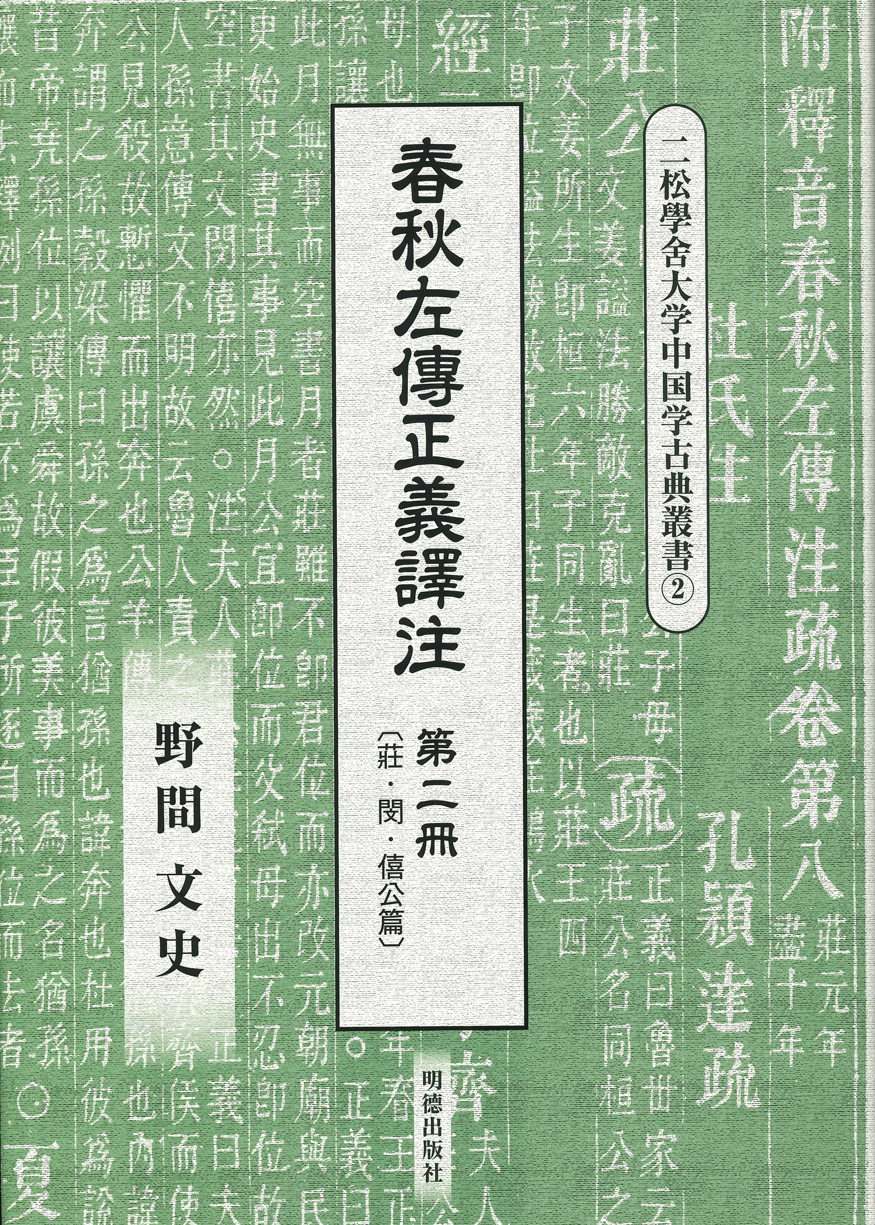 本書は孔穎達奉勅撰《春秋正義》を日本語訳し、 譯注を施したものである。 翻訳文の理解を助けるために経文・伝文・注文を附している。 全六冊。 第二冊は、 荘・閔・僖公篇。