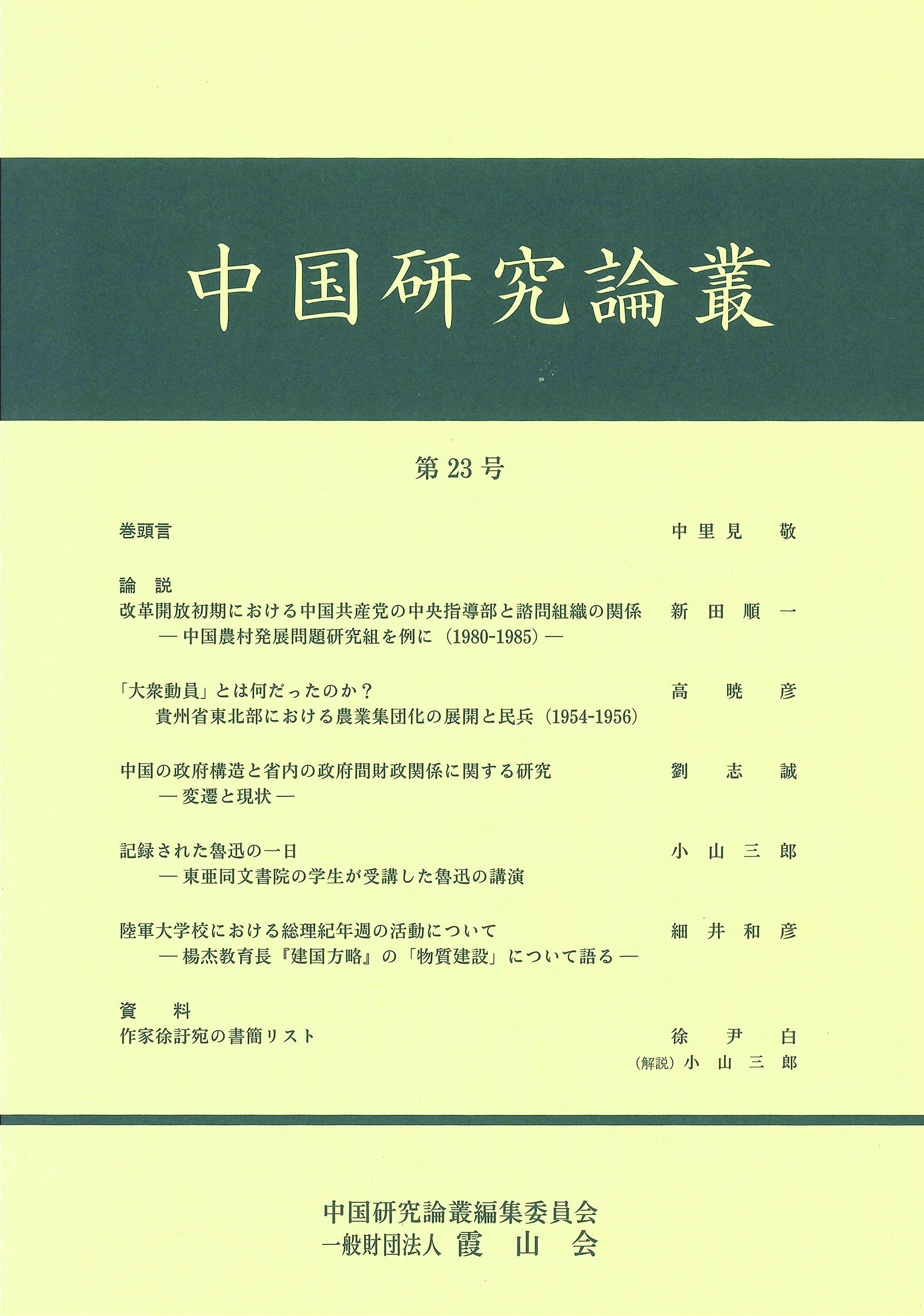 定価 1,320 円(税込) 著者 中国研究論叢編集委員会(チュウゴクケンキュウロンソウヘンシュウイインカイ) B5判並製130頁 ISBN978-4-89619-659-7 アマゾン 楽天 版元ドットコム ・目次 改革開放初期における中国共産党の中央指導部と諮問組織の関係/「大衆動員」とは何だったのか?/中国の政府構造と省内の政府間財政関係に関する研究/記録された魯迅の一日/陸軍大学校における総理紀年週の活動について