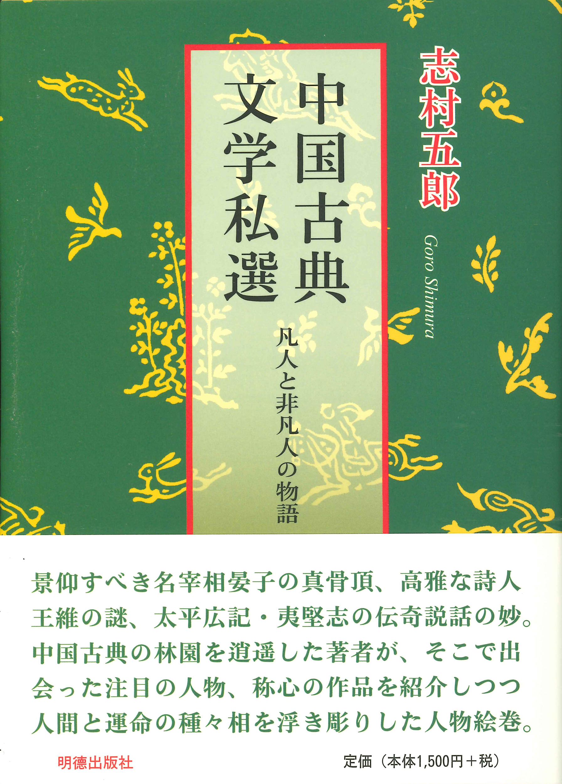 定価 1,650 円(税込) 著者 志村 五郎(シムラ ゴロウ) B6判並製 214頁 ISBN978-4-89619-191-2 アマゾン 楽天 版元ドットコム ・内容紹介 景仰すべき名宰相晏子の真骨頂、高雅な詩人王維の謎、太平広記・夷堅志の伝奇説話の妙。中国古典に造詣深い世界的数学者が、注目の人物・作品を紹介し、人間と運命の種々相を描いた人物絵巻。